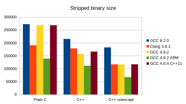 The results are surprising in many ways. Perhaps the biggest one is that using C++ and exceptions produces a smaller binaries than plain C every single time. The closest is Clang but even there C binaries take over 6% more space. Noexcept is always the smallest, but this is expected as it has no error recovery mechanism at all.