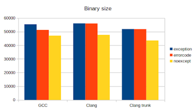 Things get even weirder with noexcept specifications. We added those to all functions in the exception code base which do not take an error object pointer in the error code version (meaning they will never throw). We then measured the sizes again and found that the resulting binaries had exactly the same size. On all three compilers. One would have expected some change (such as smaller exception unwind tables or anything) but no.